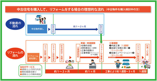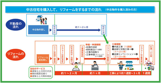 おおよそ物件の候補が決まった時点で、リフォーム業者も選択し、いろいろと相談に乗ってもらいましょう。購入前からでも当社ではご相談にのります。ゆとりのあるスケジュールで進行すれば、納得のいくリフォームが入居予定までに実現します。