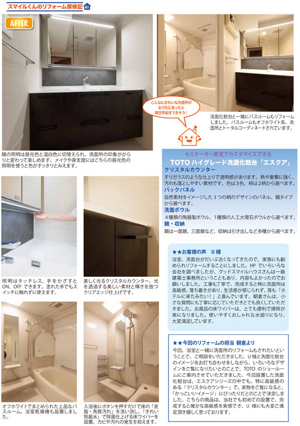 中古マンションを購入して、内装のリフォームをお願いしました。誠実さと私どもの希望を汲み取り、的確なアドバイスいただいたので、グッドスマイルハウスさんに決めました。工事後、見違えるように綺麗になりグッドスマイルハウスさんにお願いして大変満足しています。