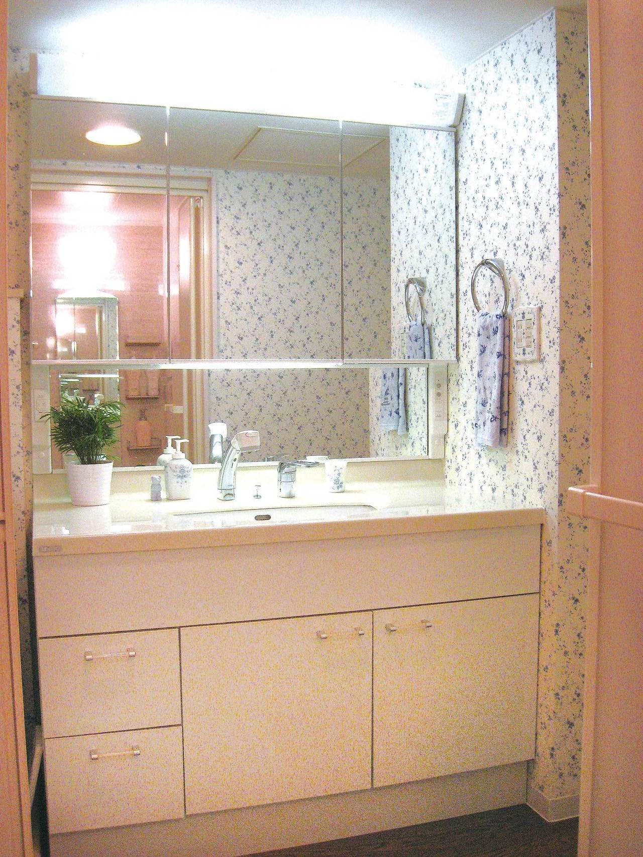 ブルーの小花模様でまとめられた洗面所です。ワイドな洗面化粧台なので、ゆったりと身支度ができます。天板はマーブル柄の人工大理石。広い三面鏡の中には十分収納があります。