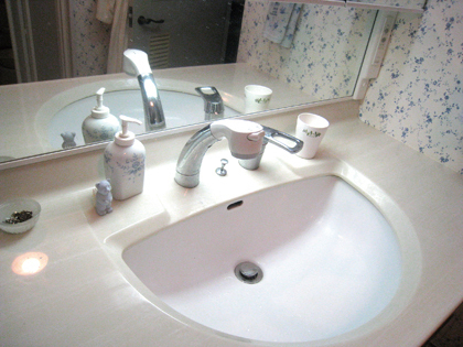 洗面ボウルが大きくなり,簡単なお洗濯もできます。水栓はシャワー切り替えタイプ。引き出すとホースが伸びてシャンプーもできます。天板は人工大理石なので丈夫でお手入れが楽です。美しいマーブル模様がクラッシックですてきです。