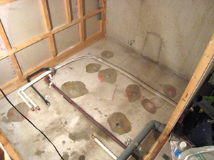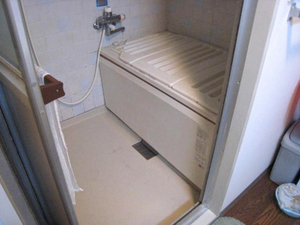 以前の浴槽、壁を撤去したところ。壁の後ろに空間がありました。今回はその隠れていたデッドスペースを活かして浴室が110%広くなりました。