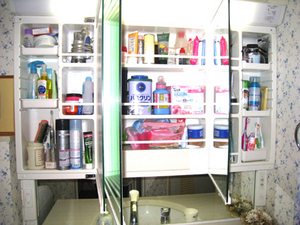 上部鏡の3面はそれぞれ後ろが収納棚になっています。洗面台下の収納とあわせるとかなりの量が収納できるので,洗面台の上はすっきり。内部にコンセントもあり、電動ハブラシの充電もできます。