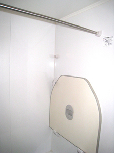 物干竿を設置。雨の日は、お部屋に干さなくても済みます。使わない時には壁側に片付けられます。蓋は壁側にかけて収納できます。