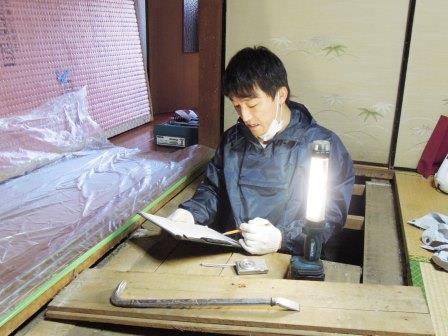 たとえば壁を叩いたり、床下の臭いを嗅いだりもします。床の調査ではスリッパを脱いで行います。床のきしみを、足裏の感覚で下地の状況を判断します。
