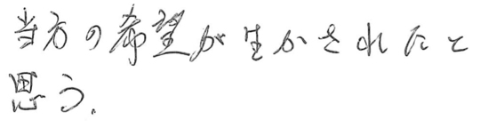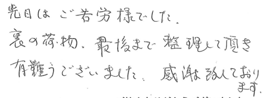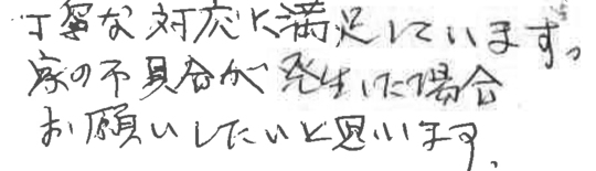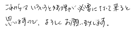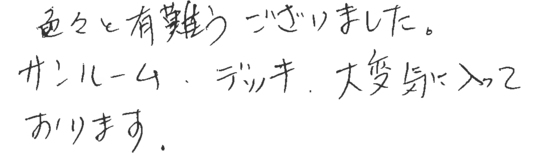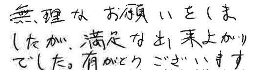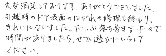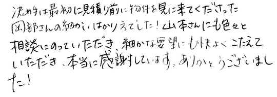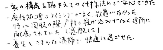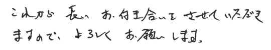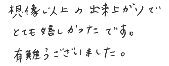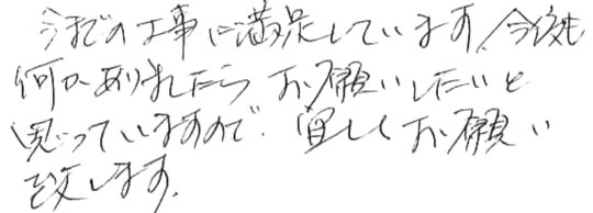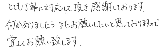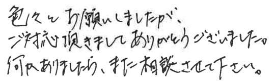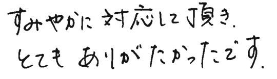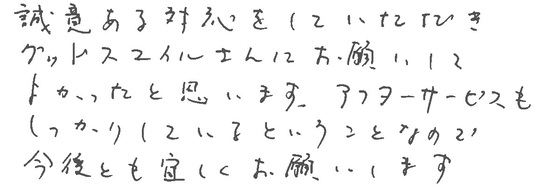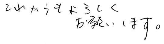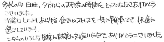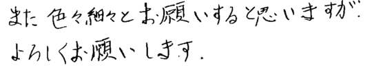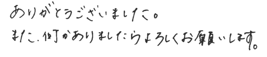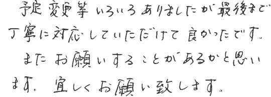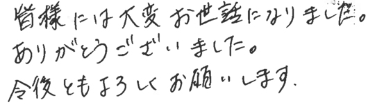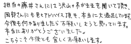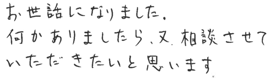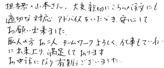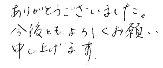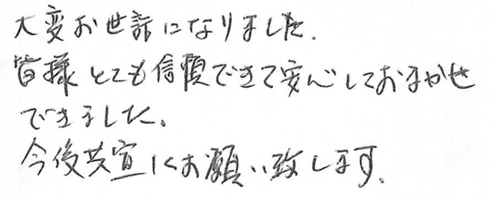 大変お世話になりました。皆様とても信頼できて安心しておまかせできました。今後ともよろしくお願いいたします。