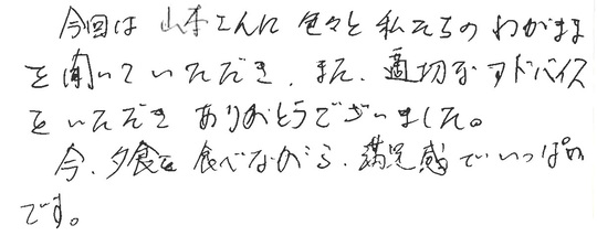 今回は山本さんに色々と私たちのわがままを聞いていただき、また適切なアドバイスをいただきありがとうございました。今、夕食を食べながら満足感でいっぱいです。