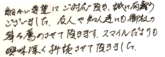 細かい要望にご対応頂き、誠にありがとうございました。友人や知人達にも御社の事を薦めさせて頂きます。スマイルだよりも興味深く拝読させて頂きました。