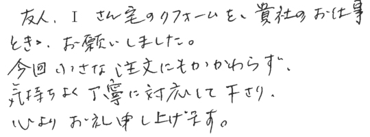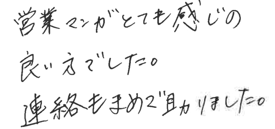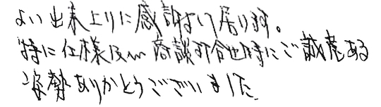 担当の山本さんには大変お世話になりました。事前の打ち合わせも質問に丁寧に答えて頂いたり、私共が気がつかない部分も親切にアドバイスを頂き、とても信頼感が持てました。突然の追加工事や変更にも対処して頂き、本当に感謝しております。ありがとうございました。
