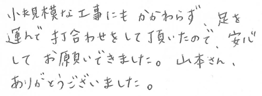 小規模な工事にもかかわらず、足を運んで打ち合わせをしていただいたので、安心してお願いできました。山本さん、ありがとうございました。