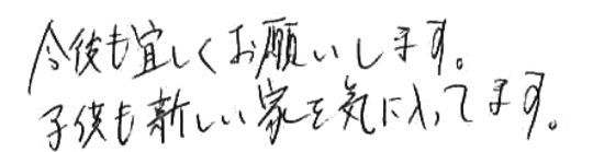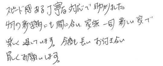 スピード感のある丁寧な対応で助かりました。4月の新学期にも間に合い、家族一同新しい家で楽しく過ごしています。今後も長いお付き合いよろしくお願いします。
