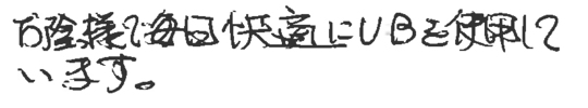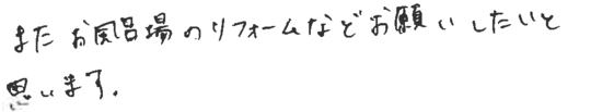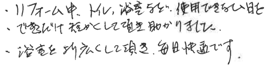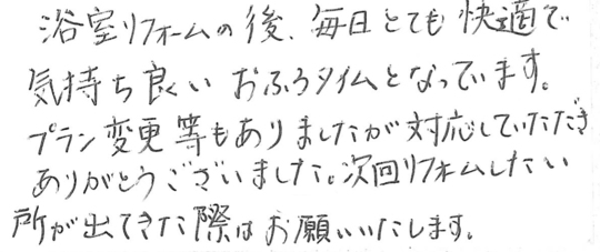 多忙の中、日曜夕方からのお打ち合わせの時間をとっていただきありがとうございました。浴室はもとよりあらゆる住まいのストレスを一気に解消でし、快適に過ごしています。