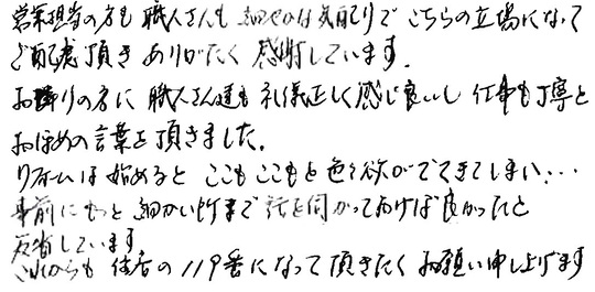 担当者の山本さん、大変親切にこちらからの注文にも適切な対応、アドバイスをいただき、安心してお願いできました。職人の方お二人チームワークよろしく、仕事もていねいに出来上がり、満足しております。お世話になりありがとうございました。