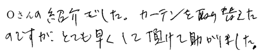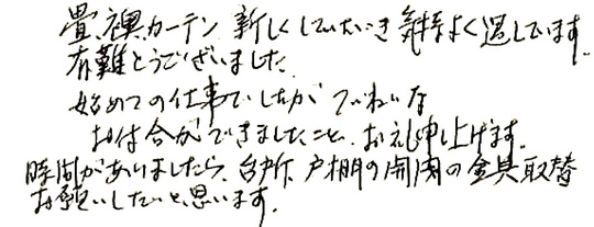 畳、襖、カーテン、新しくしていただき気持ちよく過ごしています。ありがとうございました。初めての仕事でしたが、ていねいなお付き合いができましたこと、お礼申し上げます。