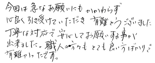 今回は急なお願いにもかかわらず心良く引き受けていただき、ありがとうございました。丁寧な対応で安心してお願いすることが出来ました。職人の方々もとても良い方ばかりで有難かったです。
