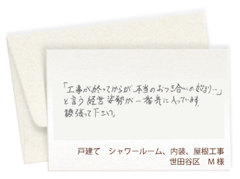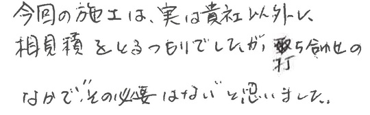 今回の施工は、実は貴社以外に相見積りをとるつもりでしたが、打ち合わせのなかで「その必要はない」と思いました。