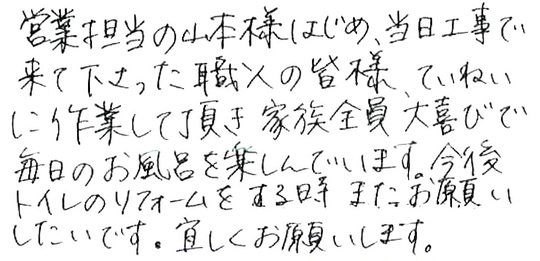 営業担当の山本様はじめ、当日工事で来て下さった職人の皆様、ていねいに作業して頂き家族全員で大喜びで毎日のお風呂を楽しんでいます。今後トイレのリフォームをする時またお願いしたいです。宜しくお願いします。