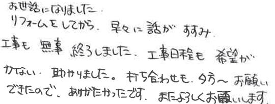 お世話になりました。リフォームしてから、早々に話がすすみ、工事も無事終了しました。工事日程も希望がかない、助かりました。打ち合わせも夕方〜お願いできたので、ありがたかったです。またよろしくお願いします。