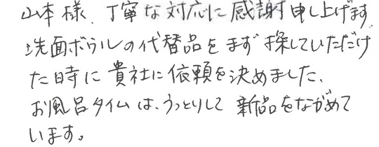 山本様。丁寧な対応に感謝申し上げます。洗面ボウルの代替品をまず探していただけた時に貴社に依頼を決めました。お風呂タイムはうっとりして、新品をながめています。