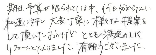 期日、予算が限られている中、何もわからない私達に対し、大変丁寧に様々な提案をして頂いたおかげで、とても満足のいくリフォームとなりました。有難うございました。