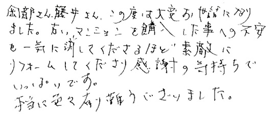 この度は大変お世話になりました。古いマンションを購入した事への不安を一気に消してくださるほど、素敵にリフォームしてくださり感謝の気持ちでいっぱいです。