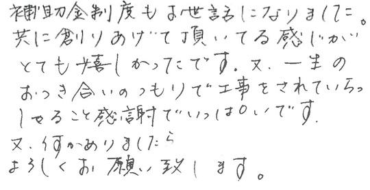 補助金制度もお世話になりました。共に創りあげて頂いている感じがとても嬉しかったです。又、一生のおつき合いのつもりで工事をされていらっしゃること感謝でいっぱいです。又、何かありましたらよろしくお願い致します。