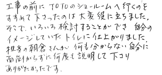 工事の前にTOTOショールームへ行くのをすすめて下さったのは大変役に立ちました。そこでいろいろ検討することができ、自分のイメージしていたトイレに仕上がりました。担当の朝倉さんが、何もわからない自分に面倒がらずに何度も説明して下さりありがたかったです。