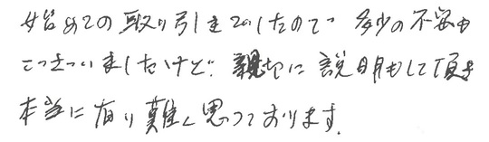 初めての取り引きでしたので、多少の不安もございましたけど、親切に説明して頂き本当に有り難く思っております。