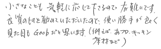 工事終了後も気になったことに対応して頂きありがとうございました。工事中も細やかなところまで丁寧につくって頂いたのでとても誠意を感じ、感謝しています。打ち合わせも納得いくまでお付き合いいただきました。おかげ様で、少しも悔いなく、気持ちよくキッチン、リビングが使えています。次はトイレをお願いしたいです。