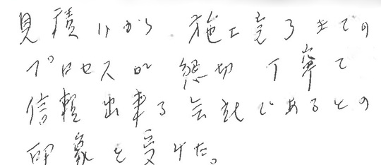 見積りから施工完了までのプロセスが懇切丁寧で信頼できる会社であるとの印象を受けた。