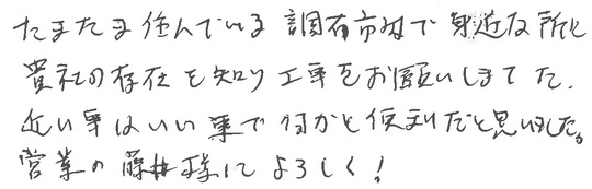 たまたま住んでいる調布市内で身近な所に貴社の存在を知り、工事をお願いしました。近いことはいいことで何かと便利だと思いました。