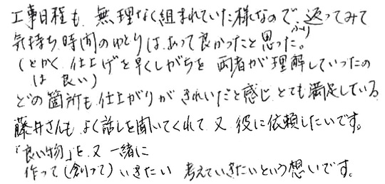 工事日程も無理なく組まれていた様なのでかえって気持ち、時間のゆとりがあって良かったと思った。(とかく仕上げを早くしがちなのを、両者がそれだけがいいわけではないと理解していたのが良い)