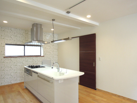 リビングに続くキッチンは、人気のあるアイランド型。共働きでお忙しいので、お子さんとお話をしながら一緒にお料理ができるのを楽しみにされています。