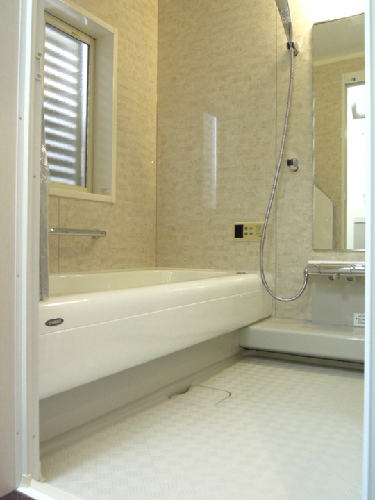 白を基調にした、清潔感のあるバスルームと洗面所。洗面所の面積を縮めたので、その分、浴室が0.75 坪から1坪に広くなりました。しかしながら洗面台はボールが広く収納スペースが大きいタイプを設置したので、収納量は十分で使いやすくなりました。