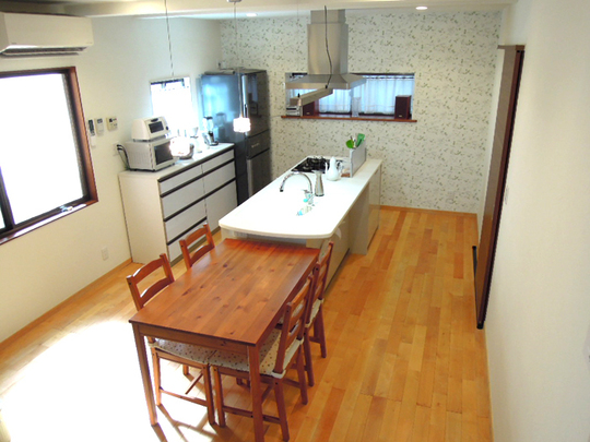細かい間仕切りのある間取りだった中古住宅を、親子でのびのびすごせる広い間取りにリフォームしました。狭苦しかった3室を、壁を取り払い、またアイランドキッチンや可動式間仕切りを取り入れたことで、大きな1部屋にもできるLDKが実現できました。壁の一部には天然石、床は無垢材にするなど、落ち着いたリビングのインテリアにもこだわりました。