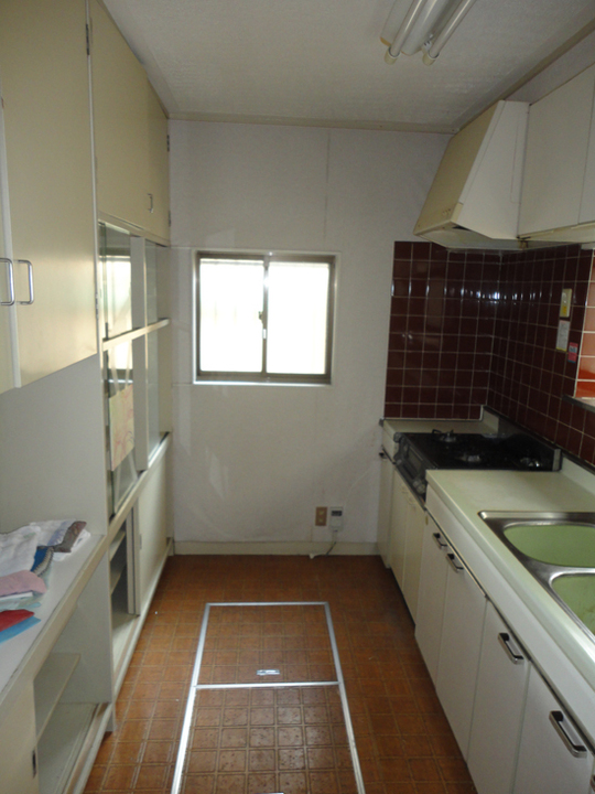 元のキッチンは設備も古く、ステンレスの天板でした。間仕切りの影にあるために暗く、壁はタイルで、掃除が大変でした。