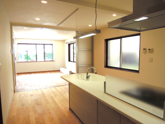 こちらは、アイランドキッチンからリビングを見通したところです。以前より広々と使えるお部屋になりました。