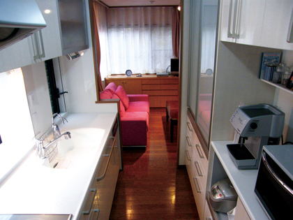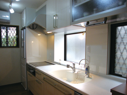 流しの前を明るい大きな窓に変え、右手にもうひとつ窓を取付けました。手元が明るくなりお料理がしやすくなりました。流しは人造大理石になり、色も明るくお手入れも一体型なので楽です。いつでもきれいな水が使える浄水器も備えています。換気扇はフィルター不要のシンプルな形状になり、お掃除がしやすくなりました。