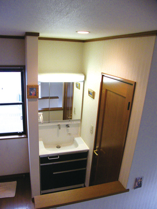 2階の一角の洗面スペース。ドアなど回りの木部の色に合わせて新しくしました。収納も豊富になりました。