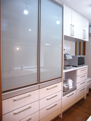 背後は新しい壁面収納を取付けました。楽な力で引き出せる上部収納や引き出し収納はとくに便利だそうです。表面はお手入れの楽な鏡面仕上げです。