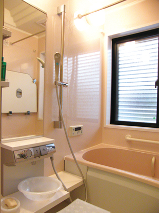 温かいピンク色をイメージカラーに。壁はきれいな花柄パターンになっています。ユニットバスに変えたことで冬でも温かく入浴できるようになりました。