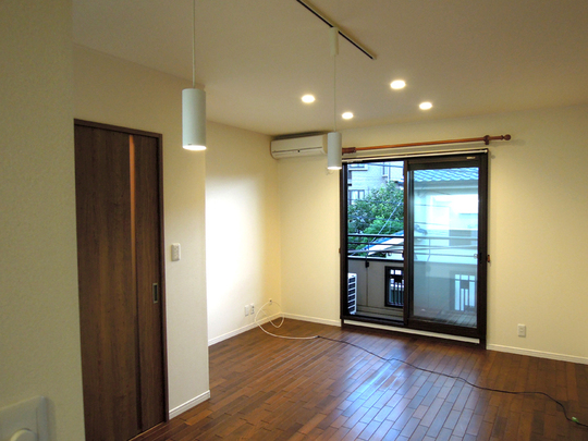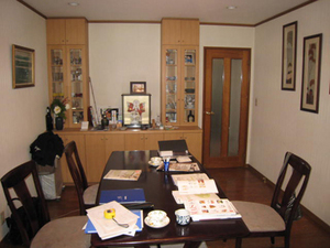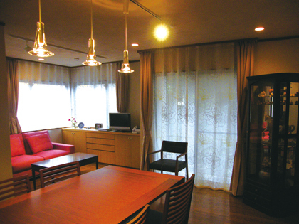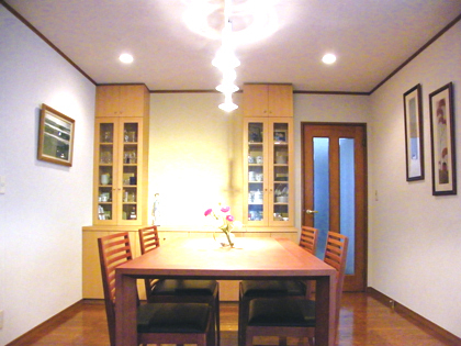 広いテーブルセットを入れ、大人数が集まってもゆとりができるようになりました。壁は健康的な珪藻土に変えました。照明はお手入れの楽な可動式LEDライトにした事で,明るくお掃除もしやすくなりました。また灯りの位置を変えて楽しむこともできます。