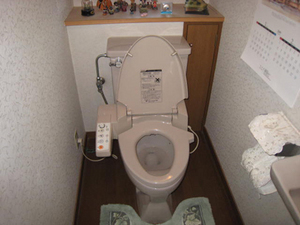 トイレも温かいピンク色に。手すりをつけて立ち座りが楽になりました。