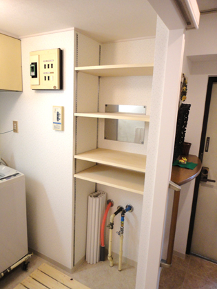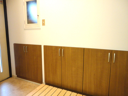 もと靴箱があった場所に、新しく棚を作りました。すのこが収納できます。