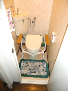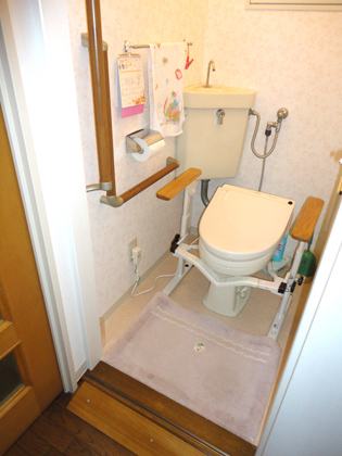 入口がバスルームと同様段差があり、開き戸が不便でした。 便器には手すりはつけていましたが、壁にも手すりがあるとより移動が楽になります。入口左手の細い壁も障害になっていました。