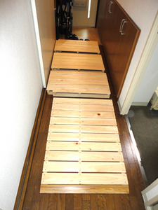 すのこにしたことで奥様にも軽く、楽に出し入れできます。またすのこを間取りに合わせて設計したことで、ゆるやかな傾斜で浴室まで車いすで移動できます。