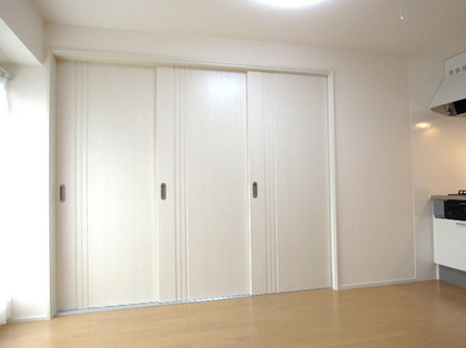 居室とリビングダイニングとの間仕切りを可動式の戸にしたので、開け放てば大きな部屋としても使えます。カーテンも揃えて新しくなり、光が明るく入る部屋になりました。