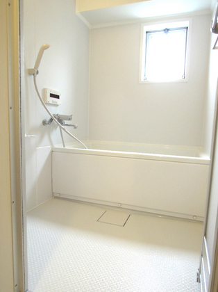 新しいユニットバスに交換しました。清潔感あふれる白いバスルームです。