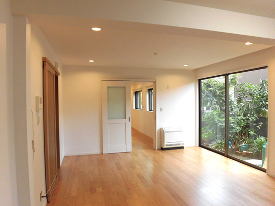 玄関を一歩入ると壁にさえぎられない広々とした空間が広がります。元の間取りは、壁でこまかく仕切られ、2世帯用住宅だったので、1階にトイレが2カ所あるなど、1世帯には不要なスペースがありました。壁を取り払うことにより、風通しや採光もよく、何より家族がゆっくりとすごせるLDKとなりました。