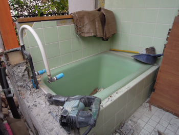 | 工事内容 | 浴室解体、搬出処分、耐震補強工事、断熱窓設置、床コンクリート工事、壁補修工事、浴室組み立て、電気・水道工事、給湯器移設工事 |