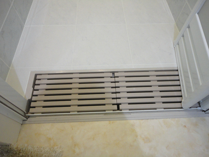 タイル張りの浴室でも、入口は段差がないバリアフリーにできます。